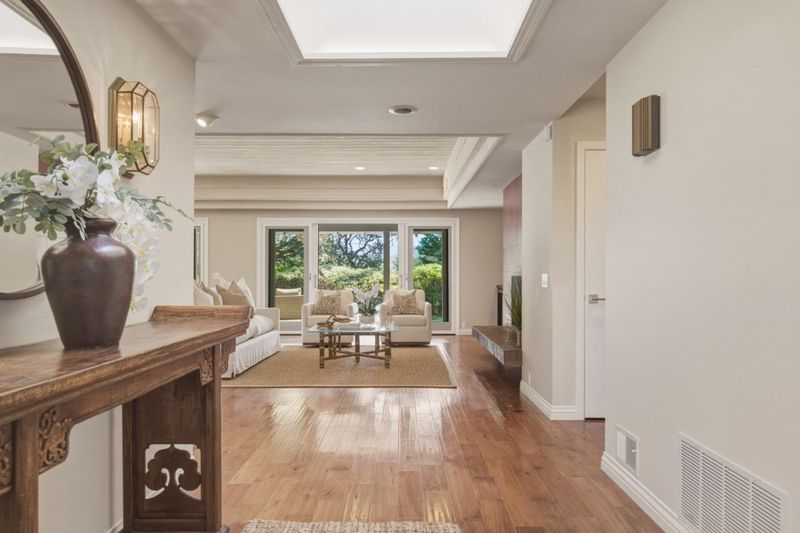 Ideally situated across from the lush green open space at the end of the MPCC driving range and surrounded by majestic oak trees, this single-level home embraces the natural beauty of Pebble Beach. The front entrance opens into an enclosed patio, offering both privacy and a warm, inviting outdoor living space. The remodeled kitchen and family room provide expansive views, creating a comfortable and casual environment for everyday living. The large, open dining and living areas feature high wood ceilings and offer easy access to both the private front courtyard with a hot tub and the backyard, making these spaces ideal for entertaining or relaxing. Three bedrooms and three bathrooms are thoughtfully arranged to ensure separation and privacy, and the home includes a security system. The spacious primary bedroom stands out with its wall of closets and extensive built-in bookshelves, offering both storage and a touch of elegance. A three-car garage is perfect for the car enthusiast. Walk to the beach, bike to Spanish Bay, or simply relax and enjoy the lovely setting.