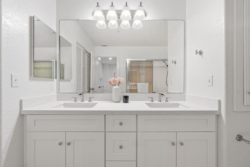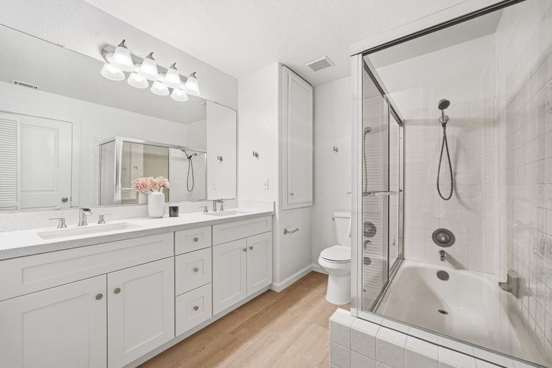 - Double Sinks, Half on Ground Floor, Primary - Oversized Tub, Primary - Stall Shower(s), Shower over Tub - 1, Stall Shower, Tile, Tub in Primary Bedroom, Updated Bath