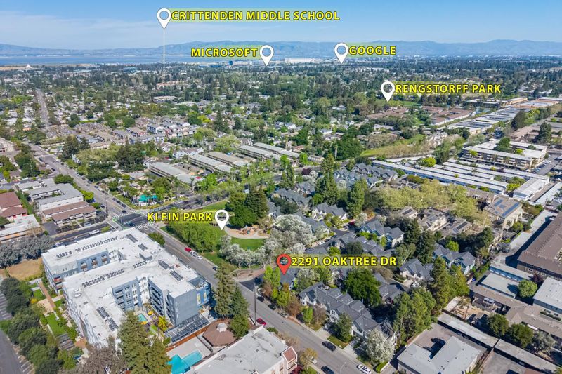 Step into this updated 3 bd/2.5 ba end-unit townhome nestled in the Oaktree Commons community. This 2-story gem offers privacy, modern amenities, and unbeatable location. The main floor invites you to relax/entertain with a smart layout. Cozy up by the fireplace in the living room, host dinners, or unwind in the back den/family room, which opens to a private fenced yard. French doors off the kitchen open to a private patio for morning tea overlooking Klein Park. Upstairs, three spacious bedrooms include a primary suite with vaulted ceilings, WIC, and a bathroom complete with soaking tub, sep shower, and a vanity/dressing area. Additional amenities include upstairs laundry hookups, central HVAC, and an attached 2-car garage with eV charger (NEMA 14-50). This move-in ready home checks all the boxes: energy-efficient dual-pane windows, LED lighting, and refreshed kitchen/baths. Easy access to Klein Park, Trader Joes, Walmart, dining, cinemas, gyms, and Caltrain plus Free MV Shuttle. Commuters will love the prox. to Google, LinkedIn, Intuit, etc. with fast connections to Highways 101, 85, and Central Expwy. With only one shared wall, ample private outdoor space, and top-rated Los Altos High School, don't miss your chance to make this home yours!