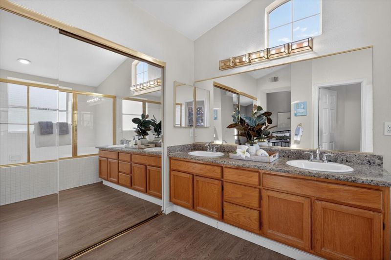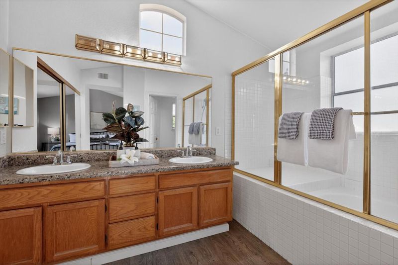 - Double Sinks, Half on Ground Floor, Primary - Oversized Tub, Primary - Stall Shower(s), Shower over Tub - 1, Stall Shower, Tub in Primary Bedroom, Updated Bath
