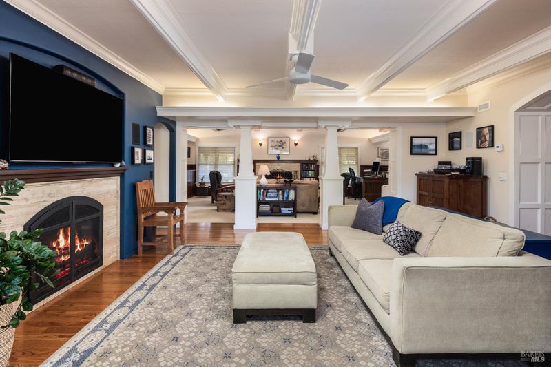 Originally built in 1948, this intriguing single-level Craftsman home is situated in a desirable downtown location and on an oversized double lot. Upon entering, you are greeted by a spacious living room with a large fireplace, creating a warm and lodge like inviting atmosphere. The living room seamlessly flows into the the spacious and formal dining area that showcases built-in cabinets and exposed wood work. Adjacent to the living room is the family room, which provides ample space for relaxation and entertainment in front of another fireplace. French doors in the family room lead out to the stone patios and pergolas, offering a seamless indoor-outdoor living experience. The gourmet kitchen is equipped with high-end appliances and ample counter space, making it an ideal setting for the aspiring chef. Off the kitchen, you'll find a convenient powder room and access to a separate one car garage. The primary bedroom suite is a tranquil retreat, featuring a spa-like bathroom and direct access to the expansive backyard and swimming pool. Two additional bedrooms and a full bathroom are on the main level. Head upstairs and you will find a private fourth bedroom with an en suite bathroom along with a flex room ideal for an office, game room or other uses. Venture outside, the meticulously maintained grounds greets you with a serene, zen-like atmosphere. Two separate stone patios includes a hot tub and covered pergolas, creates space for intimate seating or large enough for gathering and entertaining. The property boasts a solar system, and an additional separate two-car garage, providing both practicality and luxury. This unique downtown Craftsman home offers an ideal blend of modern amenities and timeless charm, making it an ideal choice for those seeking a sophisticated and comfortable living experience.