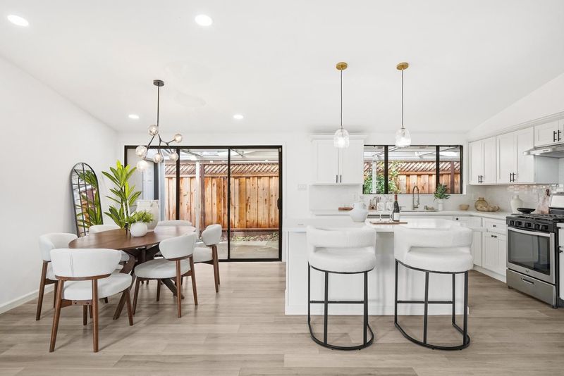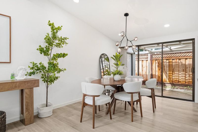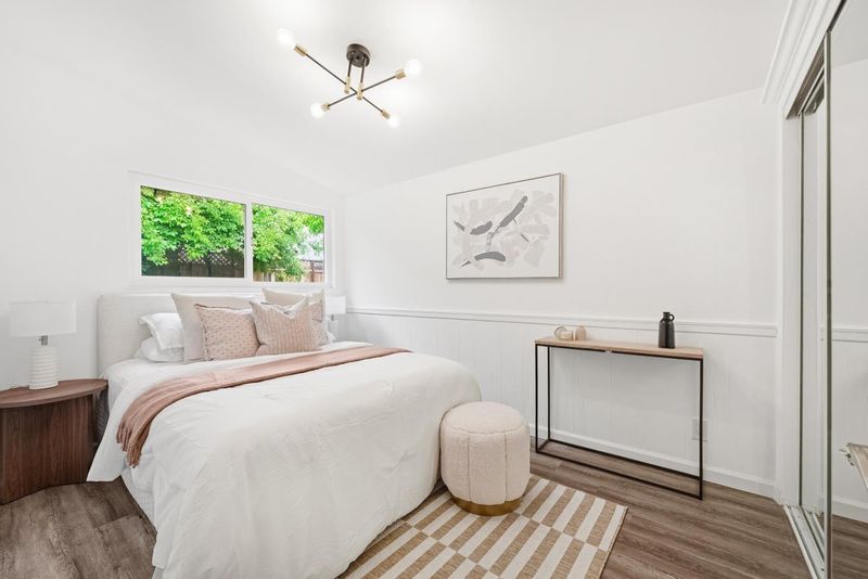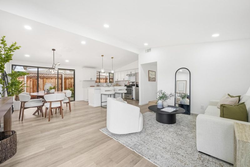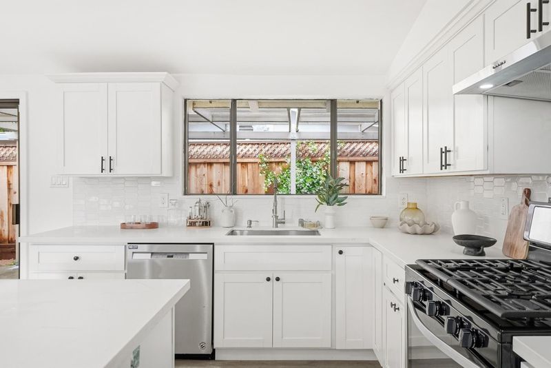Turn-key & Fantastic Commute Location in Sunnyvales Desirable Lakewood Neighborhood. This Mid-Century Modern-inspired 3-bed, 2-bath single-story home welcomes you with an open floor plan and abundant natural light. The property has been meticulously maintained and extensively upgraded, featuring recently installed central air conditioning and essential infrastructure including a newer roof, high-efficiency water heater, modern furnace, updated drain pipes, and new toilets. A sophisticated interior refresh highlights a gourmet kitchen with quartz countertops and a center island, along with fresh paint and double-pane windows throughout. The architectural character is enhanced by vaulted ceilings refined from the original open-beam to a sleek, finished sloped design with integrated lighting while the master suite offers an updated bath with double sinks and contemporary fixtures. The exterior is equally impressive with a sturdy garage door, repaired fencing, and professionally landscaped, fully irrigated yards with mature fruit trees. Centrally located minutes from Whole Foods and downtown Sunnyvale, this home offers an unbeatable commute with easy access to Lawrence Expwy, Hwy 101/237, and major campuses like Google, Apple, and LinkedIn.