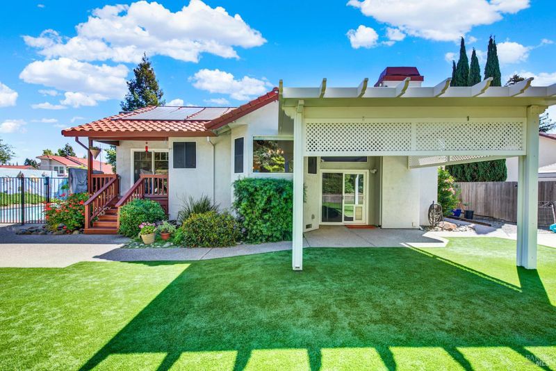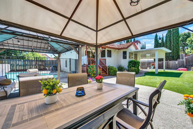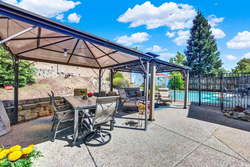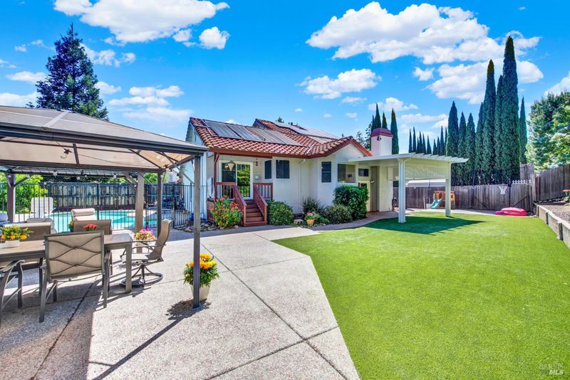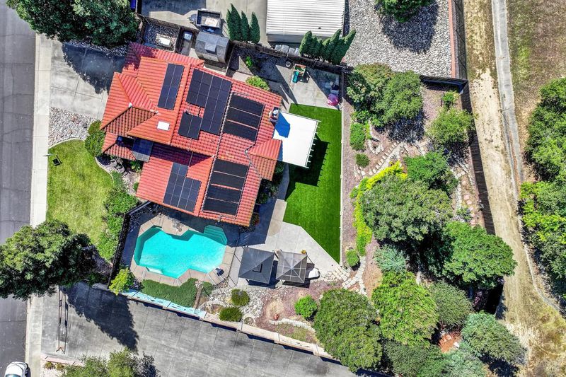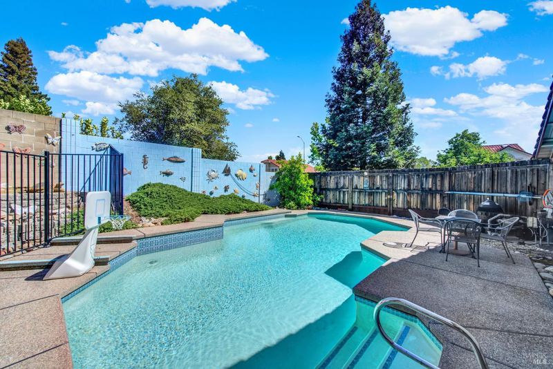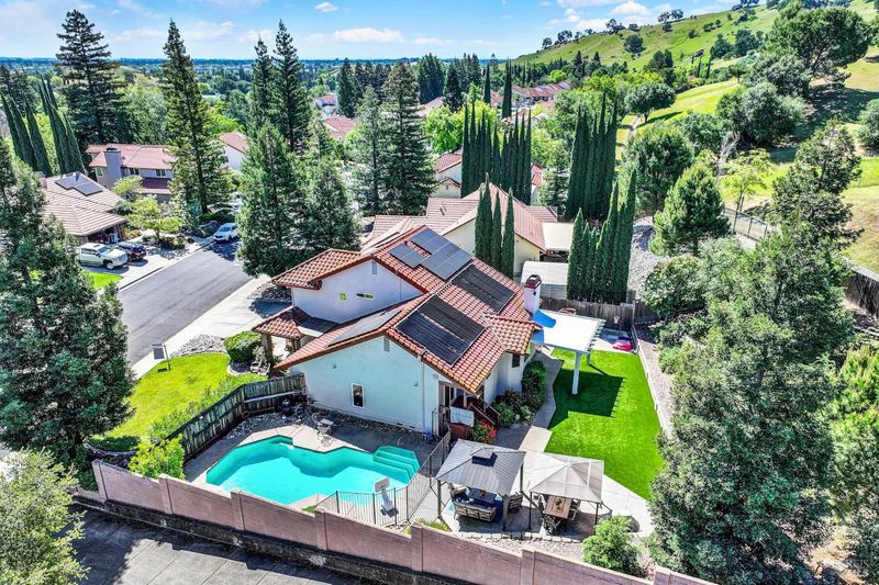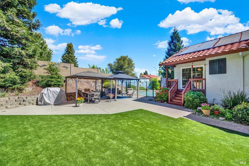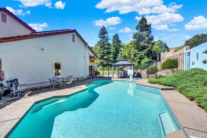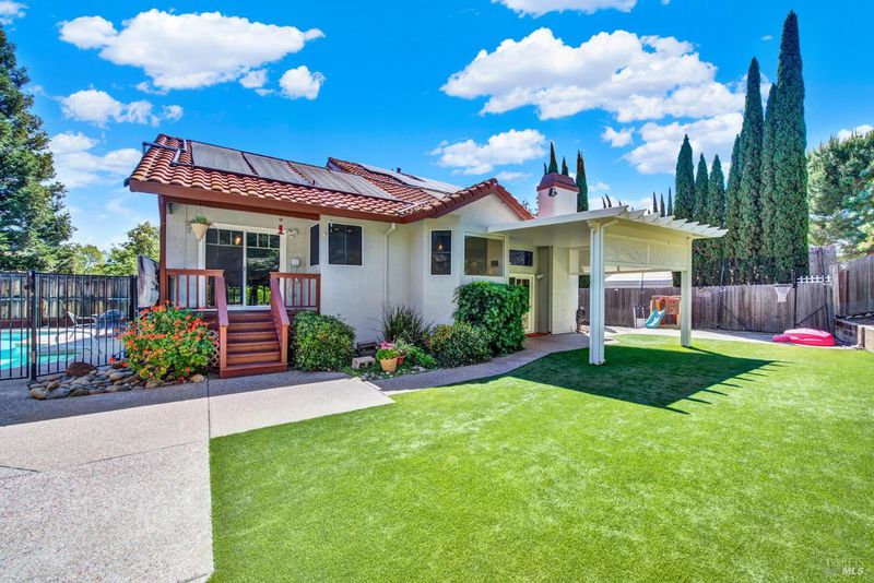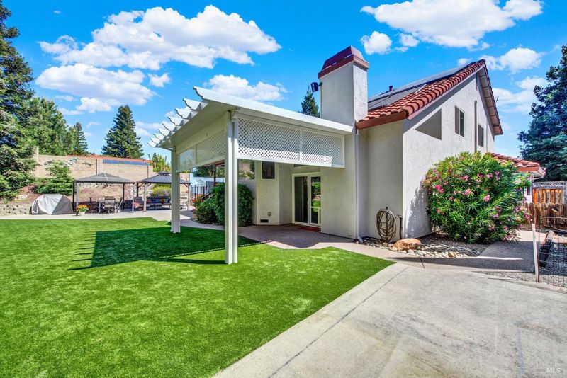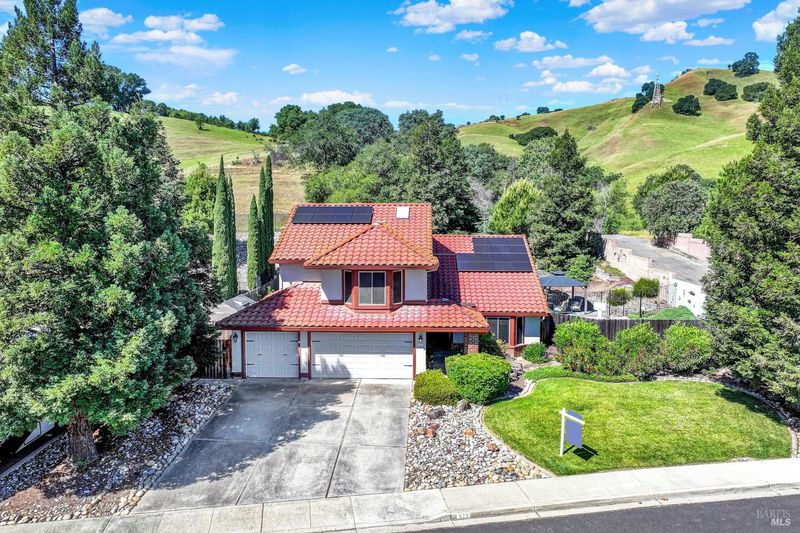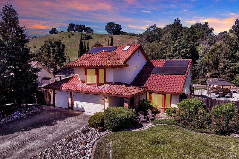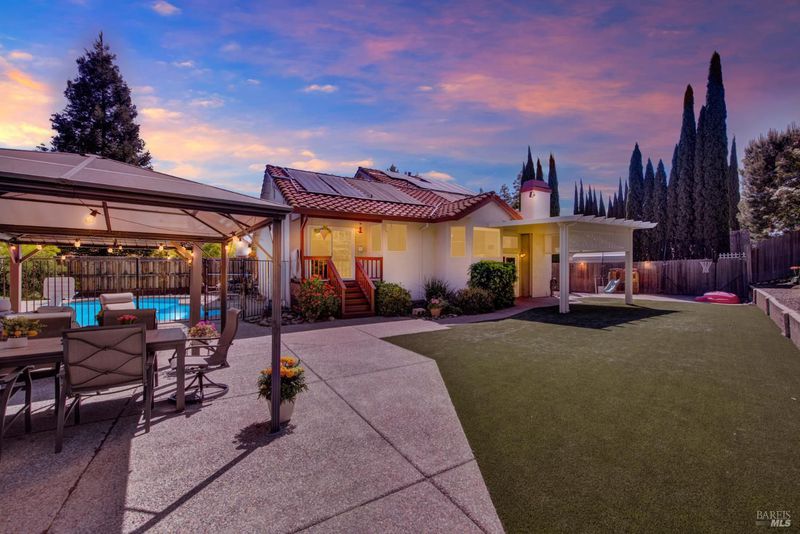This extraordinary Browns Valley residence is a true standout, gracefully positioned on a sprawling 19,600 sq. ft. lot that offers exceptional seclusion with no rear neighbors and a serene, park-like backyard setting. The captivating outdoor space is a private oasis, featuring a glistening solar-heated pool, mature shade trees, lush manicured landscaping, sculpted retaining walls, and sweeping hillside views creating an idyllic backdrop for both quiet relaxation and memorable entertaining. Inside, the kitchen is a showpiece, beautifully appointed with crisp white cabinetry, striking granite countertops and a full backsplash, gleaming stainless steel appliances, and an inviting breakfast nook bathed in natural light with picturesque views. Throughout the home, you'll find an array of refined finishes including rich, warm-toned hardwood flooring, intricate crown molding, dramatic vaulted ceilings, stylish modern light fixtures, and a charming rustic wood barn door that adds character to the dining room, along with the added benefit of OWNED solar with a Generac generator and back-up battery. With 4 spacious bedrooms and 3 full bathrooms including a highly desirable main-level bedroom and full bath this home offers both flexibility and comfort for everyday living. The luxurious primary suite serves as a peaceful retreat, complete with an expansive walk-in closet and a beautifully remodeled ensuite featuring dual vessel sinks atop a granite vanity and a sleek glass-enclosed shower with dual shower heads for a spa-like experience. Designed with entertaining in mind, the backyard is an inviting haven, showcasing an insulated patio cover for year-round enjoyment, upgraded pool equipment, and low-maintenance artificial turf perfectly blending beauty and functionality in a truly versatile outdoor escape.