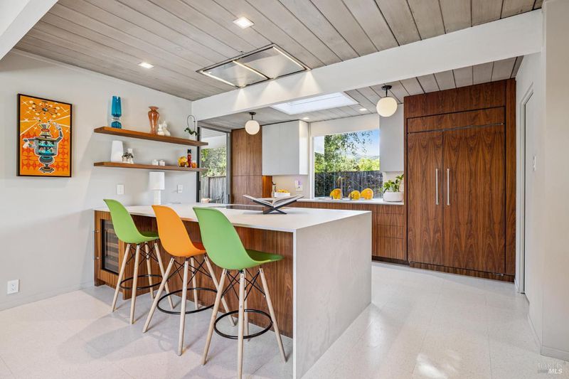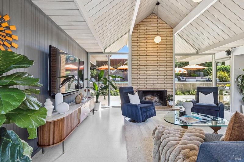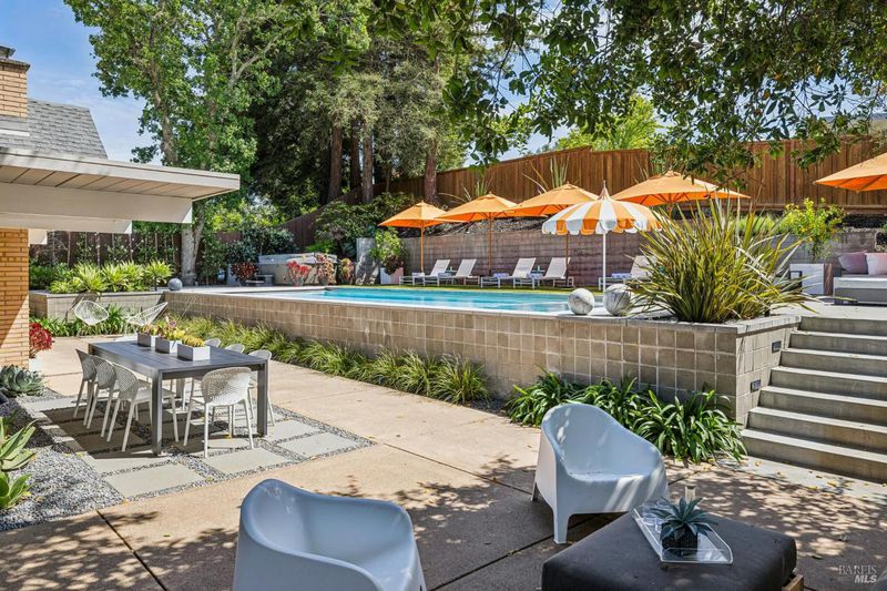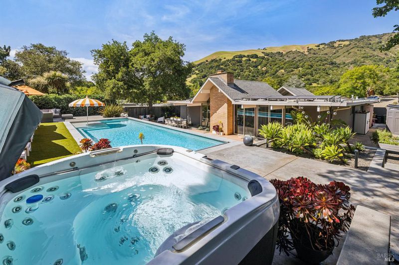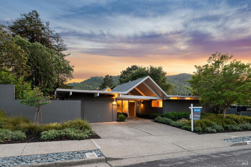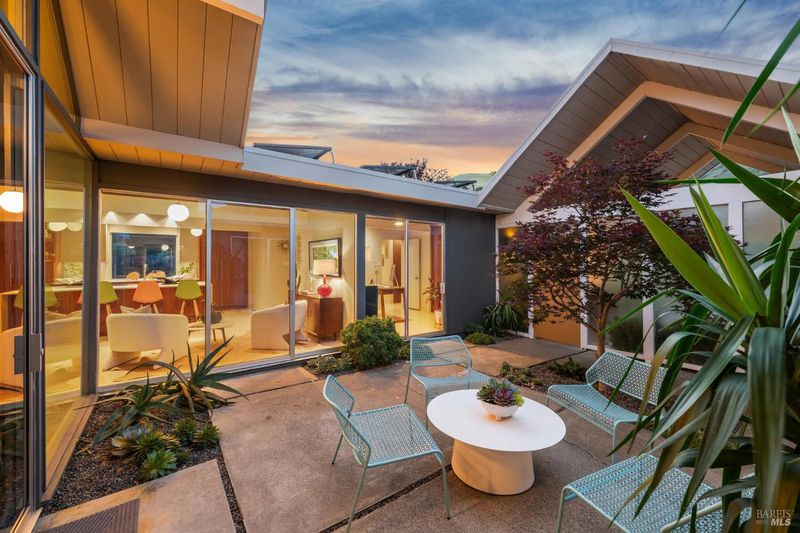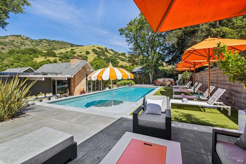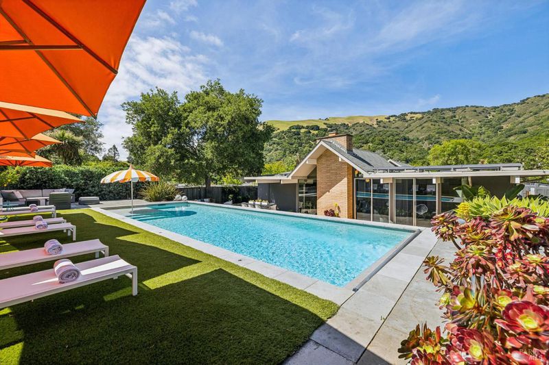 If your idea of home includes poolside cocktails, sunset views, and effortless indoor-outdoor living, this one delivers. ---Stunning double A-frame Eichler with signature atrium design and walls of glass capturing sweeping Lucas Valley hill views. Remodeled open-concept kitchen features custom walnut cabinetry, cascading quartz counters, seamless picture window, and high-end Sub-Zero and Thermador appliances including induction cooktop and dual-zone wine fridge. Designer-updated bathrooms with Fireclay tile, quartz vanities, and Waterworks fixtures. Upgrades include luxury vinyl tile flooring, recessed lighting, updated hardware, automated shades, mini-split A/C, upgraded electrical panel, on-demand boiler and hot water system, and owned solar. The fully re imagined backyard is a private resort with custom pool featuring penny tile, baja shelf, full-length bench, fountains, solar and gas heating, automatic cover, plus spa, fire pit, integrated lighting, and extensive hardscape and landscaping. Located in the Lucas Valley HOA near trails, tennis, community pool, and Big Rock Market.