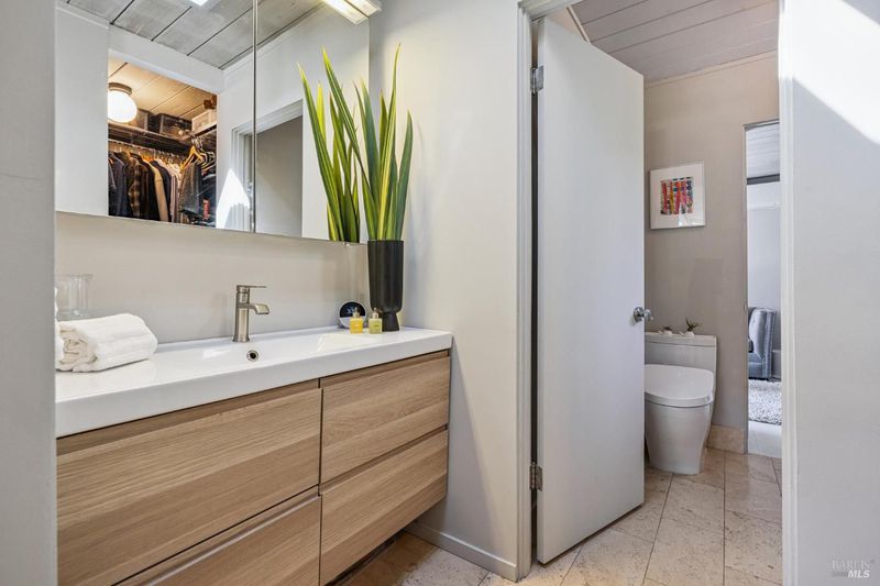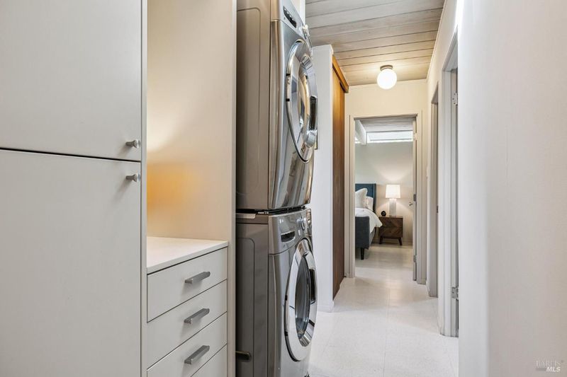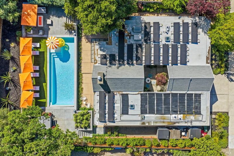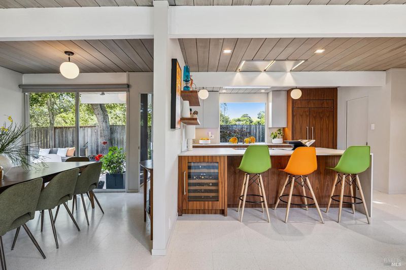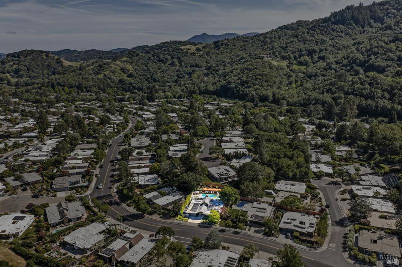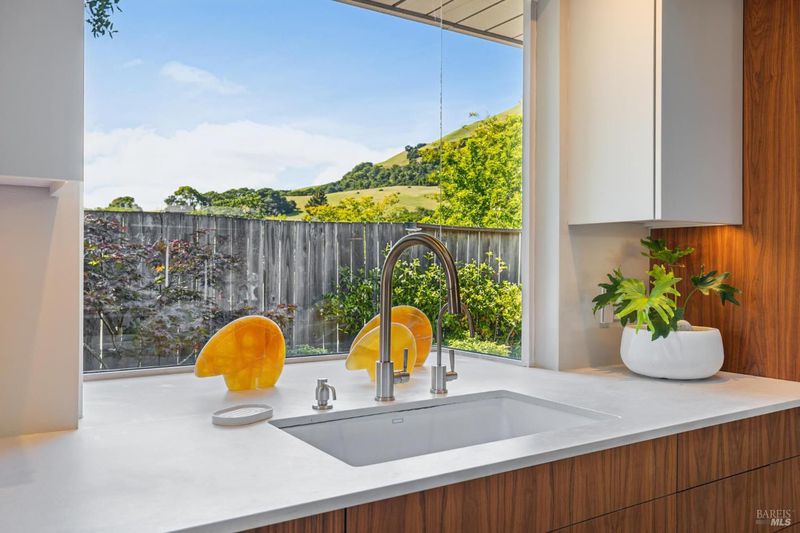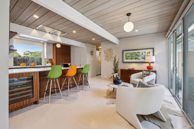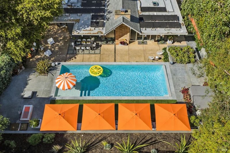 If your idea of home includes poolside cocktails, sunset views, and effortless indoor-outdoor living, this one delivers. ---Stunning double A-frame Eichler with signature atrium design and walls of glass capturing sweeping Lucas Valley hill views. Remodeled open-concept kitchen features custom walnut cabinetry, cascading quartz counters, seamless picture window, and high-end Sub-Zero and Thermador appliances including induction cooktop and dual-zone wine fridge. Designer-updated bathrooms with Fireclay tile, quartz vanities, and Waterworks fixtures. Upgrades include luxury vinyl tile flooring, recessed lighting, updated hardware, automated shades, mini-split A/C, upgraded electrical panel, on-demand boiler and hot water system, and owned solar. The fully re imagined backyard is a private resort with custom pool featuring penny tile, baja shelf, full-length bench, fountains, solar and gas heating, automatic cover, plus spa, fire pit, integrated lighting, and extensive hardscape and landscaping. Located in the Lucas Valley HOA near trails, tennis, community pool, and Big Rock Market.