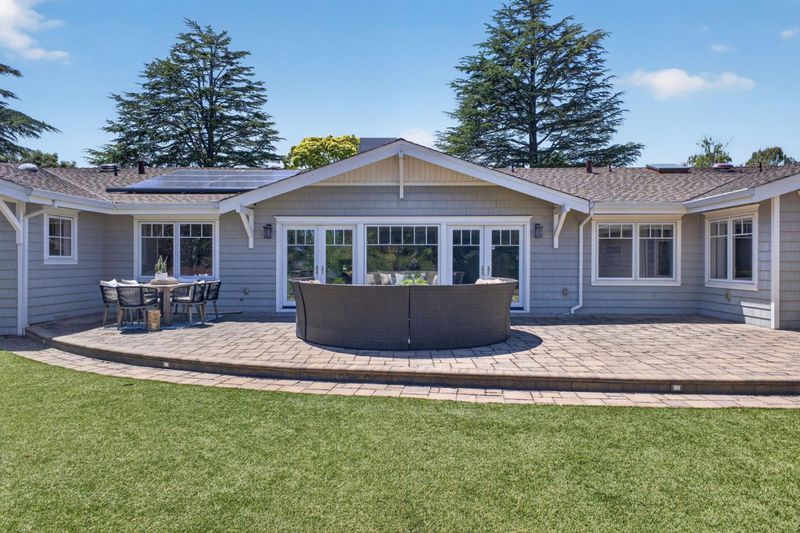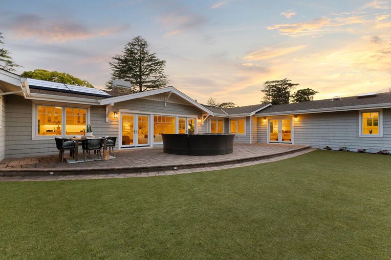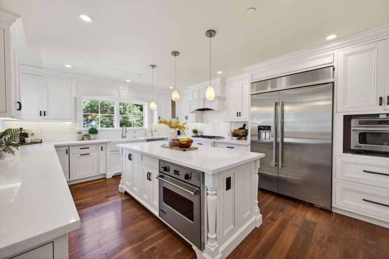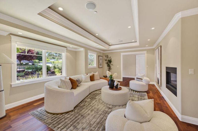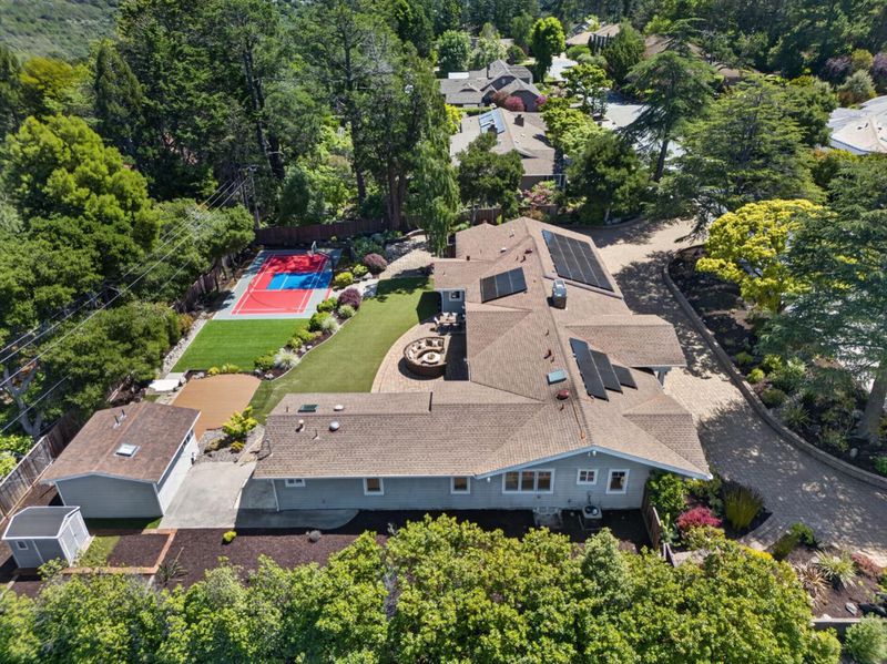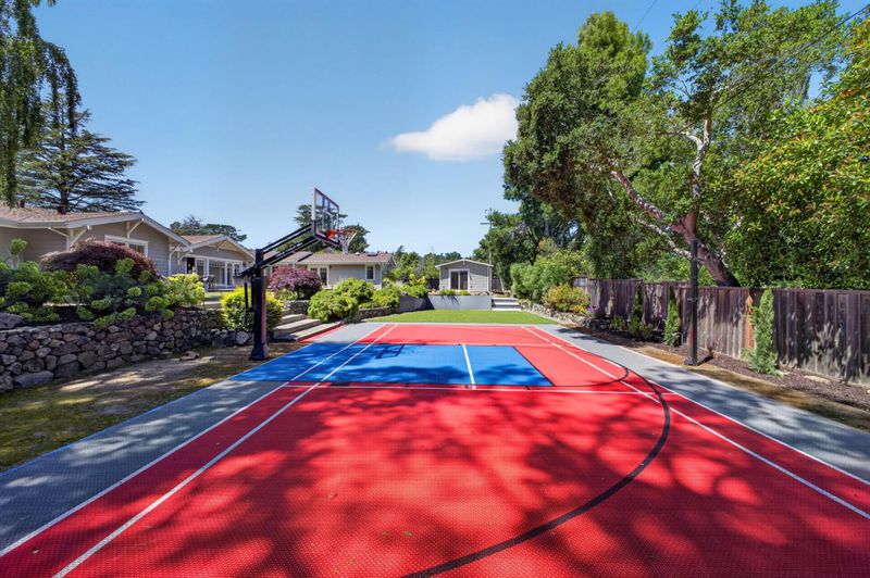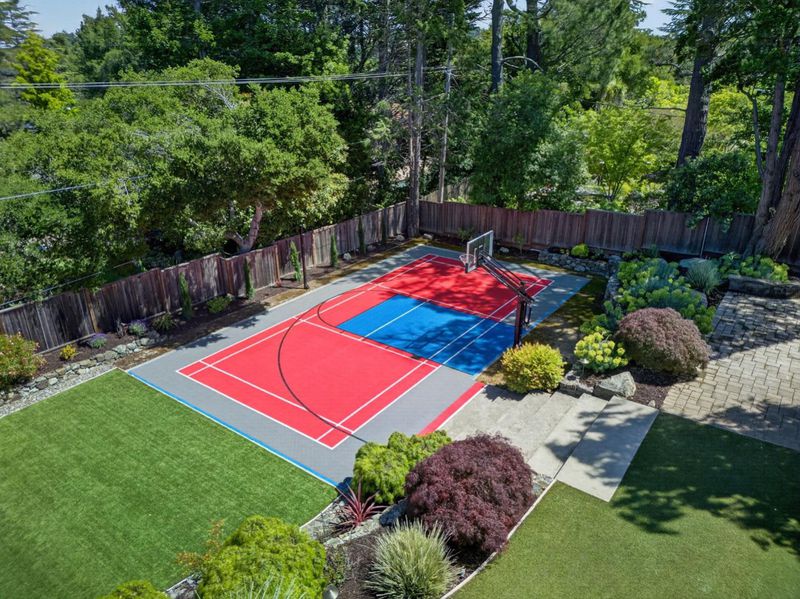 A MUST SEE, BEST OF THE BEST! Set on a flat, park-like half-acre lot, this beautifully renovated and expanded single-story home blends timeless elegance with modern functionality. A circular paver driveway leads to a covered front porch while also extending to a spacious motor court, providing access to a side-entry three-car garage with 2 Tesla EV chargers. Inside, hardwood floors and recessed lighting enhance a thoughtfully designed layout. A formal living room with a dual-sided fireplace--shared with the family room--flows into the formal dining area. The updated chef's kitchen features quartz countertops, a large island, stainless-steel appliances, abundant cabinetry, and a breakfast nook with a nearby powder room. French doors in the family room open to an expansive patio for seamless indoor-outdoor living. The private wing offers four bedrooms and four updated baths, including a luxurious primary suite with backyard access, dual walk-in closets, & a spa-like bath with soaking tub and glass shower. Grounds include turf lawns, a studio with kitchenette and powder room, a deck, and a pickleball court beneath a sport surface. Solar panels and a Tesla Powerwall add efficiency. 1510 Kingswood Dr represents the very best of Hillsborough living. Don't miss this turnkey masterpiece.